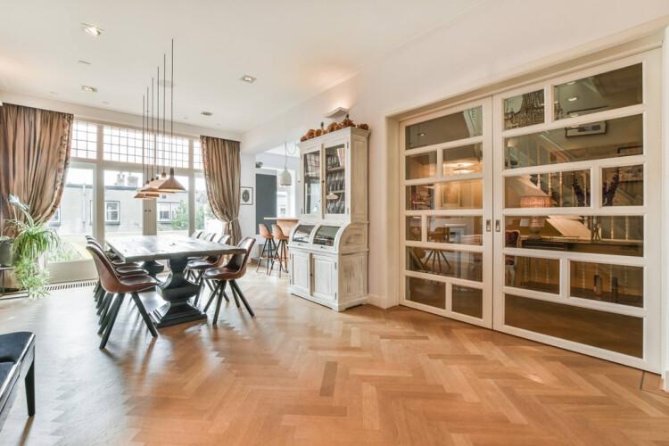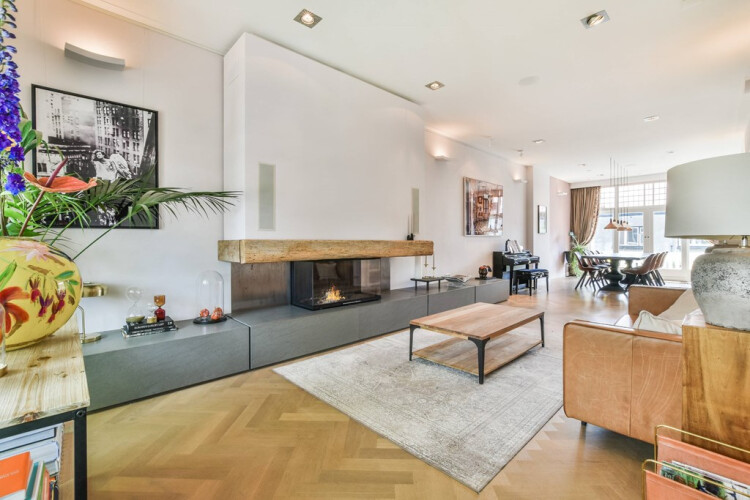 Via een eigen ingang met authentieke jaren ’20 tegels leidt een ruim trappenhuis u naar de woning. De op maat gemaakte glazen schuifdeuren en visgraat parketvloer brengen u naar het woongedeelte waar alle ruimtes met elkaar in verbinding staan. In het zitgedeelte valt direct de moderne haard op met een brede Pietra Serena natuurstenen voet. De haard meubel kan eveneens gebruikt worden als thuisbioscoop met beamer- en ingebouwde speaker. De open haard is een Spartherm hoog-rendements open haard. Aan de achterzijde van de woning leidt een ruim eetgedeelte naar het balkon op het zuiden. De moderne Miele Warendorf open keuken met een ontbijtbar is voorzien van diverse inbouwapparatuur zoals een 5 pits gasfornuis, stoomoven, combimagnetron, Quooker en wijnklimaatkast.