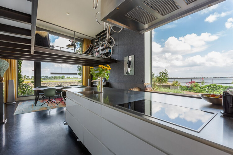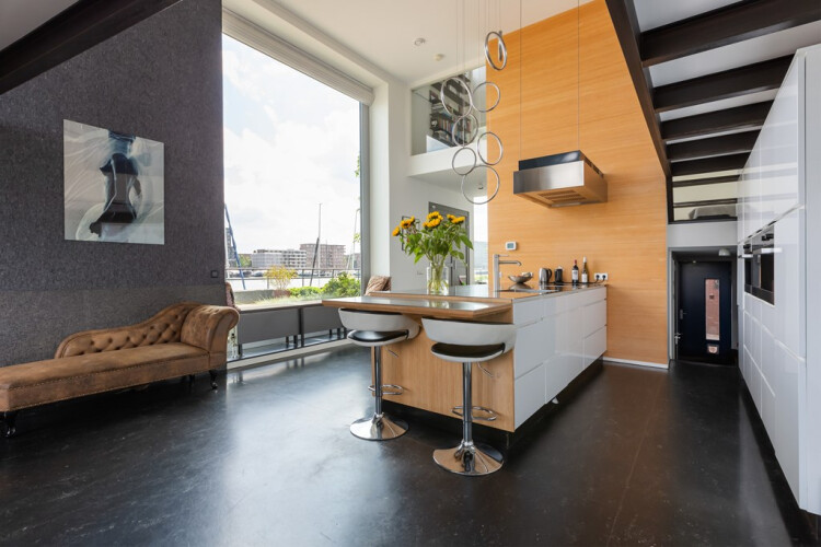Een fantastische zeer hoogwaardig afgewerkte hoekwoning met geweldig uitzicht over het water, met ligplek voor een boot, en dakterras van 110m².