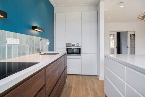 On the backside kitchen is equipped with a composite stone countertop and built-in appliances: a 5-burner induction hob with extractor, oven/microwave combination, dishwasher and refrigerator. Via the kitchen / dining are you have access to the .