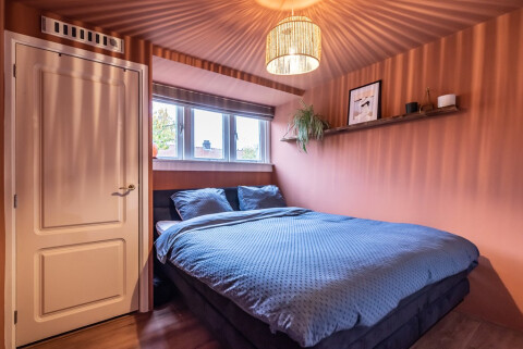 Back to the hallway of the house, besides a separate toilet, you find the stairs to the first floor. Here you find the master bedroom, nicely decorated with a comfortable bed. Here you will easily catch a good night’s sleep. You can store your wardrobe in a closet and a cabinet.