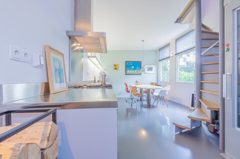 Enter the house on the ground floor. This is where you find the modern kitchen and dining room, with floor heating. The kitchen is equipped with a gas stove, oven, hood, dishwasher, microwave, fridge, freezer, washing machine, and dryer. From this level, you can take the stairs or elevator up one level to the first bedroom, toilet and bathroom.