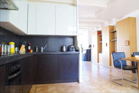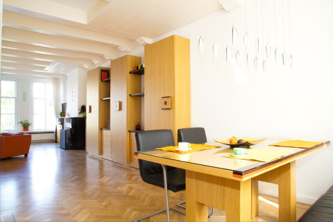 The +/- 90m2 apartment is modern and tasteful furnished, peaceful and quiet, due to the wall, ceiling & floor insulation and it has double-glazing. The whole apartment is recently renovated has oak parquet floors and is very light. The apartment contains: A living area with an antique chimney and a spectacular 3 window view on the canal, a dining area and a modern and fully equipped kitchen, a separate toilet, a bathroom with separate shower & bathtub and a 1.20 m wide washbasin one master bedroom with more than 4-meter made on measure wardrobe and small guest room with a twin sleeping couch. The icing on the cake is a large terrace of +/- 25 M2